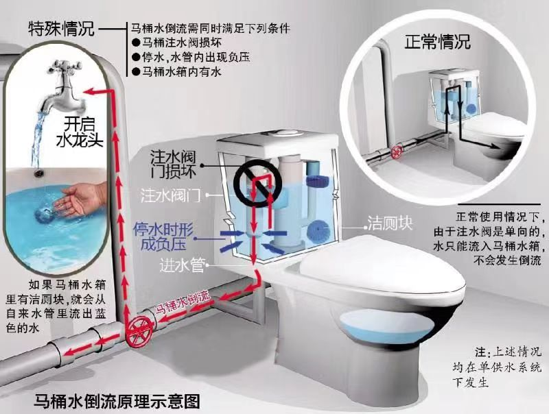 個(gè)別用戶發(fā)現(xiàn)從水龍頭中放出的自來(lái)水有時(shí)會(huì)呈現(xiàn)藍(lán)色。出現(xiàn)這種現(xiàn)象是因?yàn)橛脩粼趲鋬?nèi)放有潔廁靈(藍(lán)色),同時(shí)馬桶進(jìn)水管止回閥損壞導(dǎo)致。正常情況下,在管網(wǎng)壓力的作用下,水的流向是正向的。但由于停水或者樓下有用水,在開(kāi)啟閥門(mén)或水龍頭的瞬間,由于水流的突然變化,使樓上未用水的管道內(nèi)產(chǎn)生了瞬時(shí)負(fù)壓,將水箱內(nèi)的水抽入管道內(nèi),即產(chǎn)生了藍(lán)水現(xiàn)象。只需加裝止回閥,即可解決問(wèn)題。