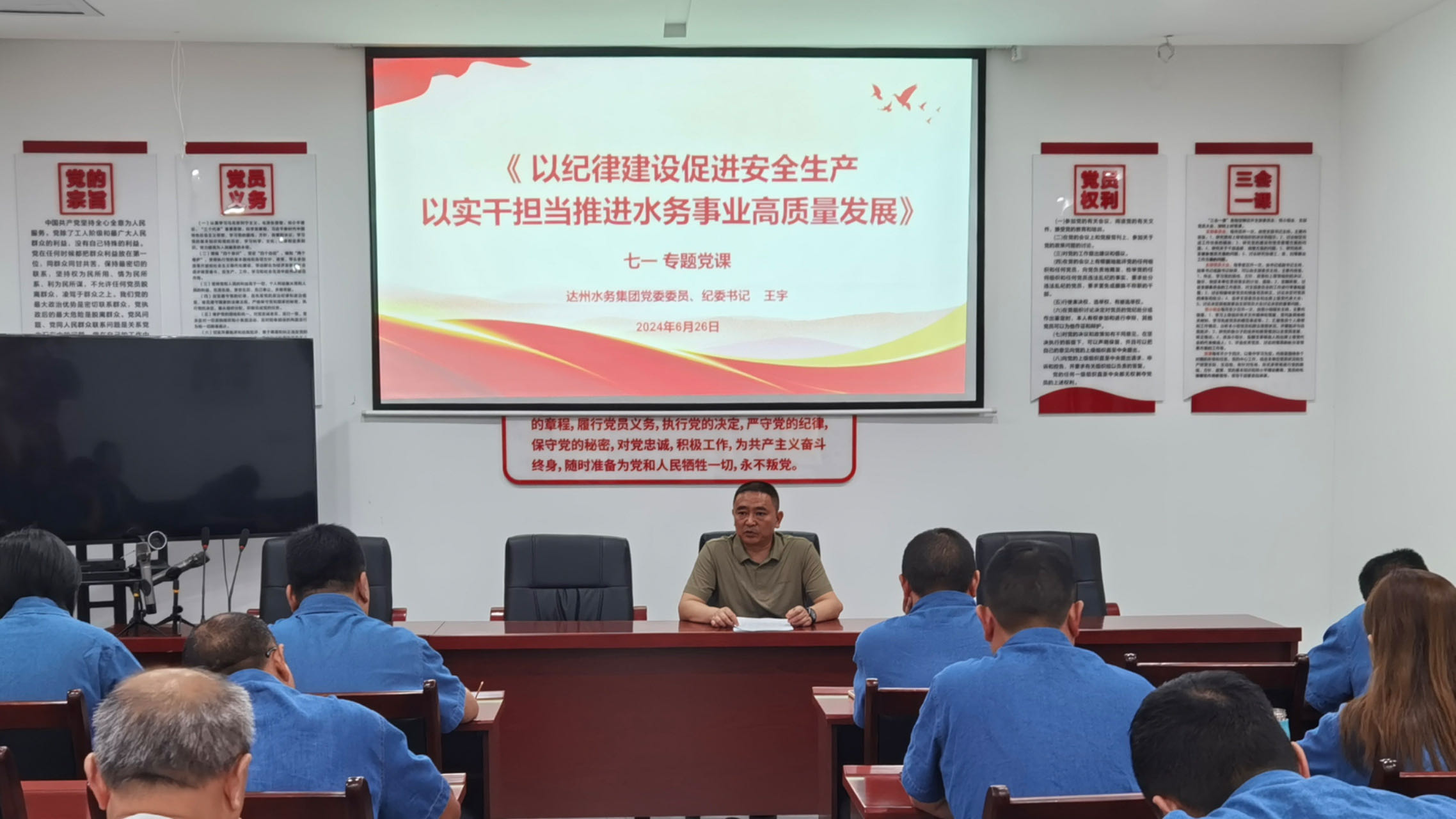 6月26日上午集團(tuán)公司黨委委員、紀(jì)委書記王宇同志在惠潤達(dá)公司支部以《以紀(jì)律建設(shè)促進(jìn)安全生產(chǎn) 以實(shí)干擔(dān)當(dāng)推進(jìn)水務(wù)事業(yè)高質(zhì)量發(fā)展》為主題,講了一堂專題黨課。