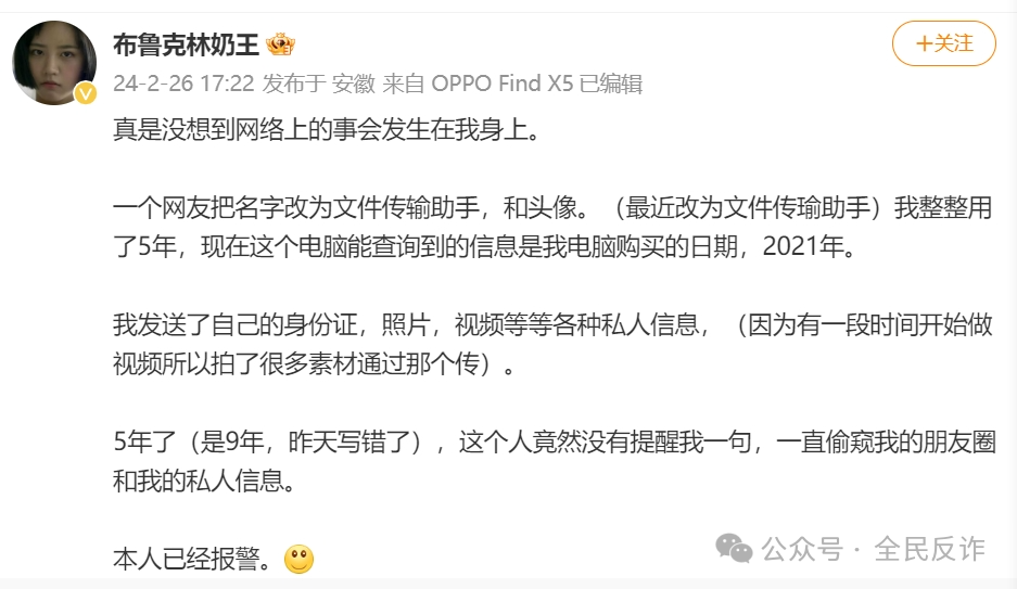 從其表述中得知:2021年開始,就用手機(jī)給微信里的“文件傳輸助手”傳資料,包括身份證信息和各種賬號密碼、自己所拍攝的素材等。直到最近,因?yàn)榘l(fā)現(xiàn)朋友圈有個人名字很奇怪:傳瑜文件助手,去看對方朋友圈,從口吻上推斷是個男孩。就去找對方問,打微信電話也不接,發(fā)消息讓對方停止也不回復(fù),所以去報案。