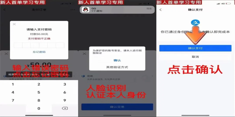 對(duì)方讓小張用支付寶購買指定的商品,在付款時(shí),先輸入錯(cuò)誤密碼,然后進(jìn)入刷臉驗(yàn)證環(huán)節(jié),認(rèn)證本人身份后,在跳轉(zhuǎn)的頁面中點(diǎn)擊確認(rèn)支付。