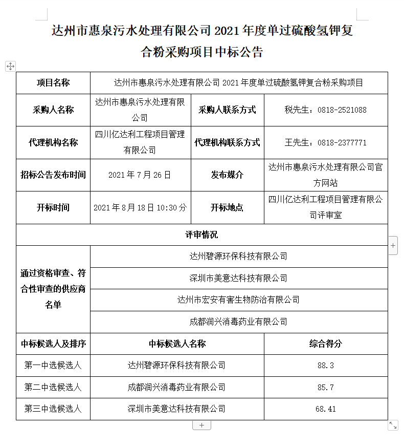 標題:達州市惠泉污水處理有限公司2021年度單過硫酸氫鉀復合粉采購項目中標公告